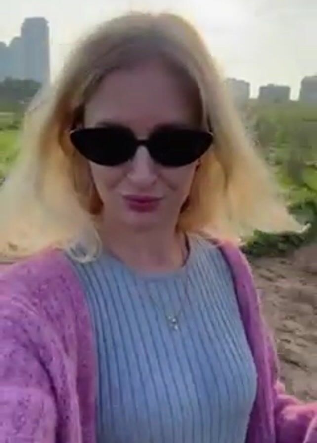 A woman with blonde hair, wearing sunglasses, a gray shirt, and a pink cardigan, is walking on a dirt path. She's holding a green coffee cup in her hand. The background features green vegetation, a city skyline with some buildings under construction, and a partly cloudy sky. The camera is held by the woman, creating a selfie-style perspective. She appears to be talking to the camera.