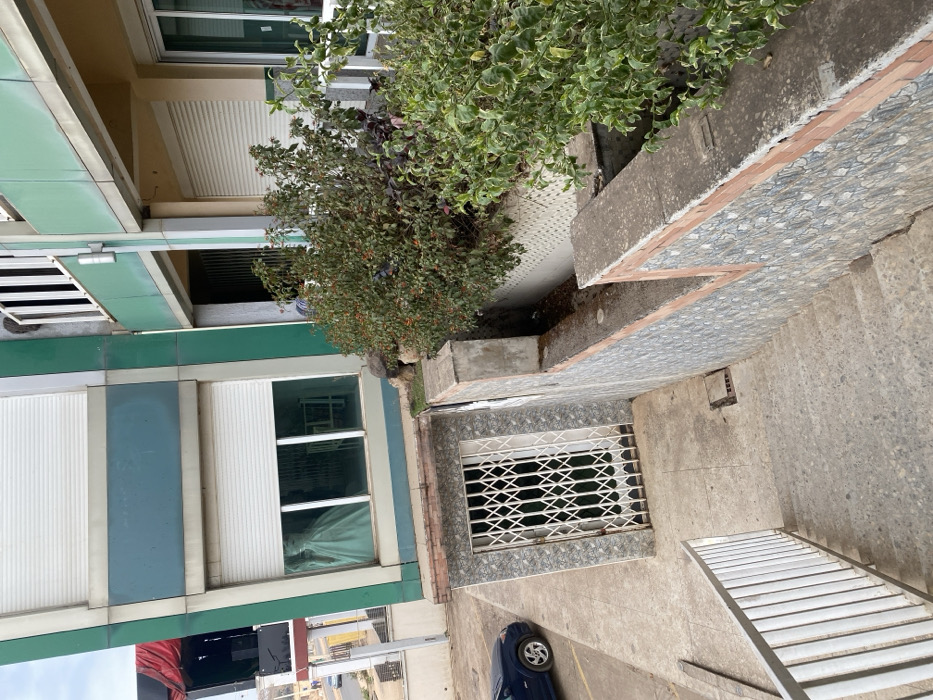 A blue car is parked near a gated entryway to a building. Above the gate is a ledge with a bush growing on it. The building has white and blue exterior walls. A set of stairs leads up to the entrance. The building has multiple floors with windows and balconies. A part of the building is painted in green.