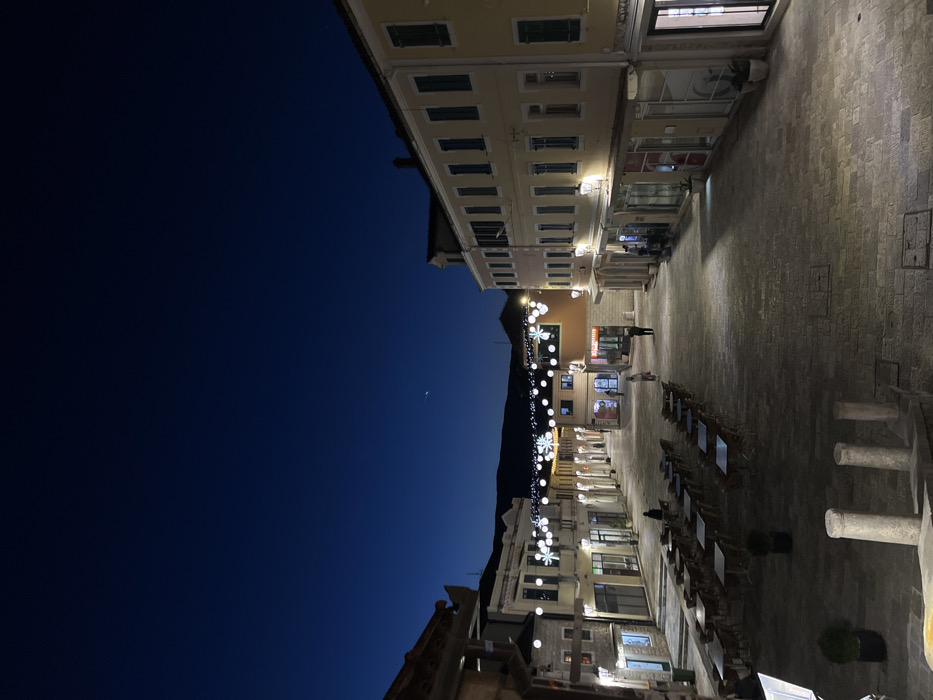 A nighttime street scene with buildings lining a cobblestone walkway. The sky is a deep blue, fading into twilight. Buildings are lit from within, and strings of lights hang overhead. Tables and chairs are lined up on one side of the walkway, suggesting a restaurant or cafe. A few people are visible in the distance.