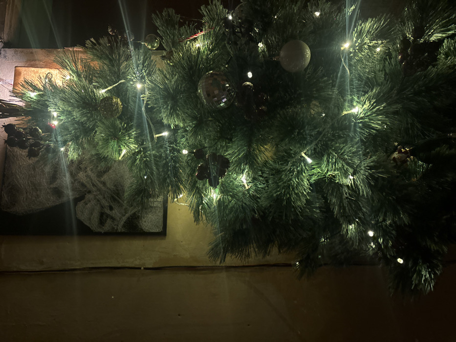 A lit Christmas garland rests atop a surface. The garland, thick with green needles and twinkling white lights, features ornaments like mirrored disco balls and gold spheres. To the left, a dark framed piece with light-colored designs is visible. The surface below the garland is an ambiguous tan color, partially obscured by shadow. The overall lighting is dim, highlighting the garland and its ornaments.