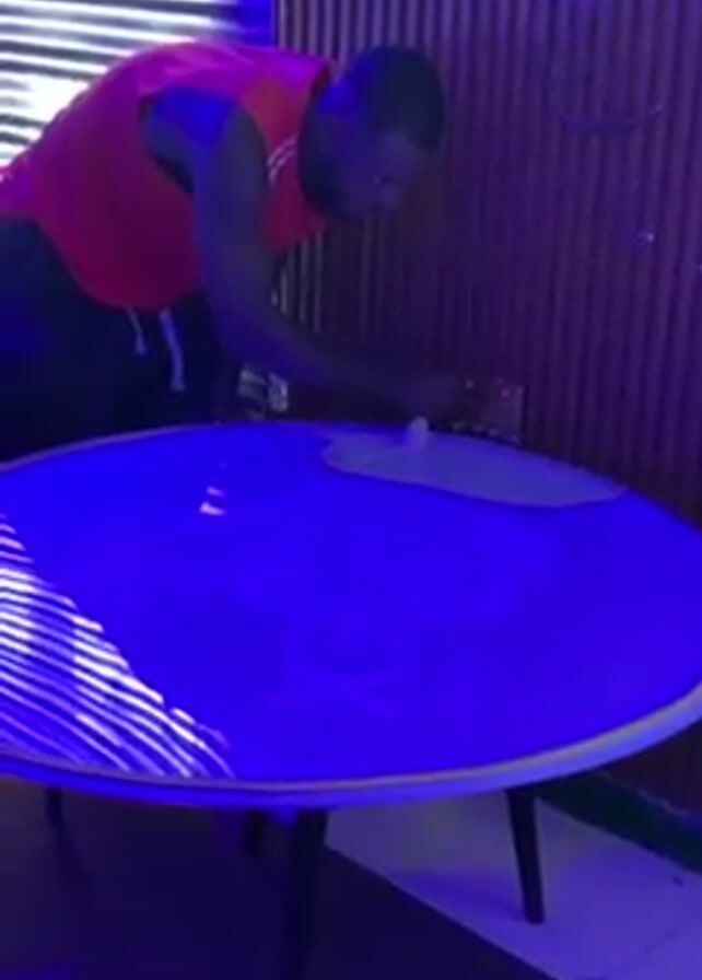 A man in a red tank top stands bent over at a round table, carefully placing small items on the table. The table has a reflective surface illuminated with blue light. Behind the table is a striped wall. Music plays softly in the background.