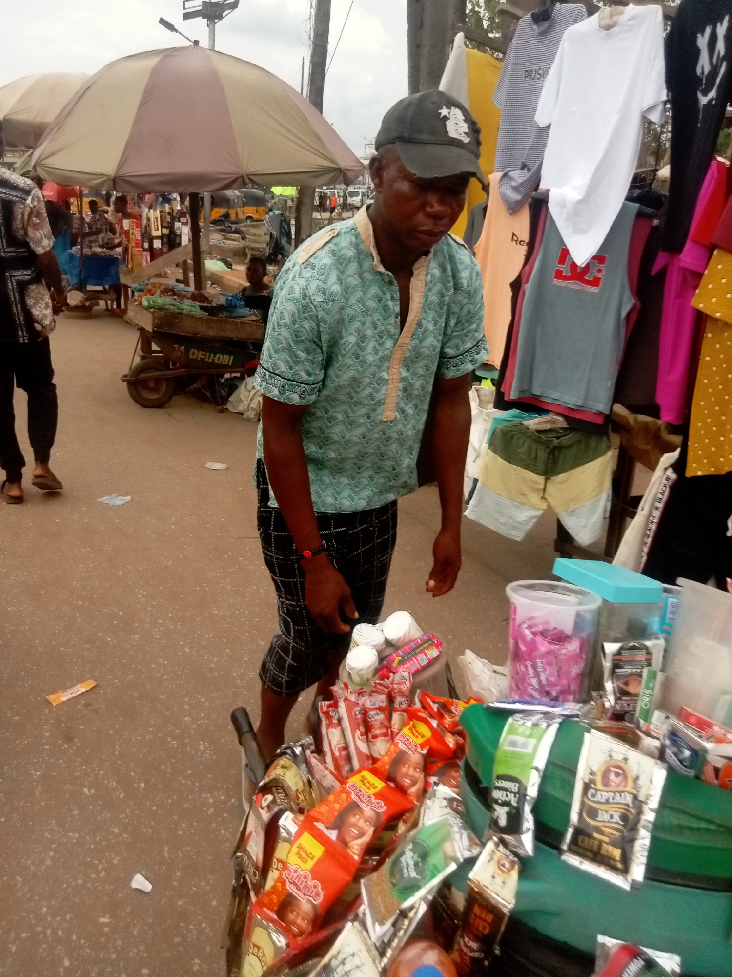 The image depicts a man standing beside a cart loaded with assorted snacks and drinks in what appears to be a bustling marketplace in Onitsha, Nigeria