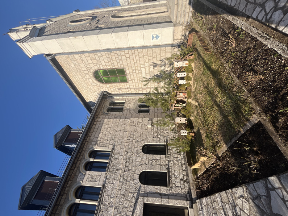 The image displays an exterior view of the Church of Saint Anthony of Padua and an adjacent monastic or residential building in Cetinje, Montenegro, under a clear, bright blue sky. Strong sunlight illuminates the scene, casting prominent, elongated shadows across the foreground. The building on the left, associated with the monastery, presents a light-colored, rough-hewn stone facade. It features multiple arched windows with dark frames; two are visible on the ground floor, flanking a dark, recessed entrance door on the far left. Upper levels also display arched windows. The roofline includes two distinct, dark-roofed dormer windows. To the right, the Church of Saint Anthony of Padua exhibits a similar light-colored stone construction. Its visible side elevation includes a large, tall arched window with distinctive green-tinted glass, positioned above which is a smaller circular window. The church's main facade, partially visible on the far right, features a tall bell tower structure culminating in a cross. A blue and white heraldic crest is affixed to the church wall near its entrance, from which stone steps descend. In the foreground, a landscaped garden area occupies the space between the viewer and the buildings. It comprises a central patch of green grass, bordered by beds of dark, cultivated soil on both the left and right sides. The soil beds contain sparse, dormant plant growth. On the grassy area, a miniature decorative display is arranged, featuring several small evergreen trees, multiple small, light-colored structures resembling houses or buildings, and a central manger-like structure containing small figures. These elements are set upon a moss-like ground cover, separated from the grass by a low, light-colored fence. A stone-paved walkway with irregular light-colored flagstones is visible on the far left, leading towards the dark entrance door of the adjacent building. No individuals are present in the scene, and no actions or interactions are depicted.