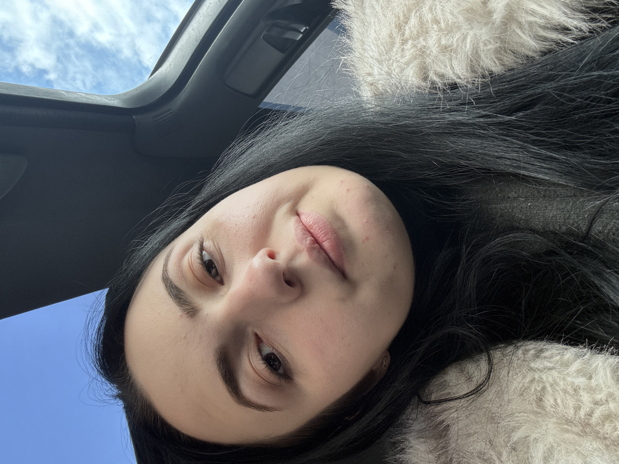 A close-up selfie image captures a young adult female from the chest up, positioned inside a vehicle. The subject has long, straight, dark hair that falls over her shoulders and a fair complexion with minor blemishes visible on her chin. Her dark eyes are open and directed towards the camera, and her lips are slightly parted with a neutral to subtle expression. She is wearing a dark, high-necked garment, possibly a turtleneck, beneath a light-colored, fluffy, textured outer layer, appearing to be a coat or jacket. The perspective is tilted, with the subject's head leaning slightly to the viewer's right. The upper and right portions of the frame reveal dark, molded plastic or fabric interior components of a vehicle, consistent with a car's headliner and window frame. Beyond the vehicle's interior, a clear blue sky with scattered white clouds is visible, indicating an outdoor, daytime setting. The specific city location of Yambol, Bulgaria, or any other specific geographical location, cannot be determined from the visual evidence within the image.