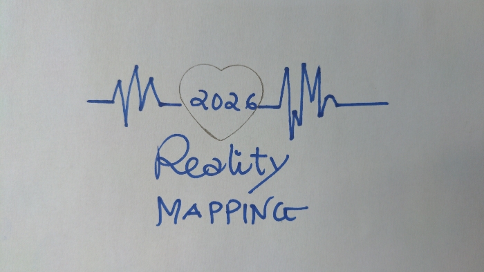 The image displays a flat lay composition on a white background, consistent with a piece of paper, located in Longuo 'A', Tanzania. Centrally positioned, a horizontal line drawn in blue ink mimics an electrocardiogram (ECG) waveform, featuring prominent peaks and valleys. Approximately in the middle of this blue line, a heart outline, drawn in a lighter brown or gold-colored ink, encompasses the numbers "2026" written in blue ink. Directly below the ECG line and heart graphic, the word "Reality" is written in blue cursive script. Below "Reality," the word "MAPPING" is written in blue capital letters. The overall impression is a static image of handwritten text and symbols. No individuals or dynamic actions are present.