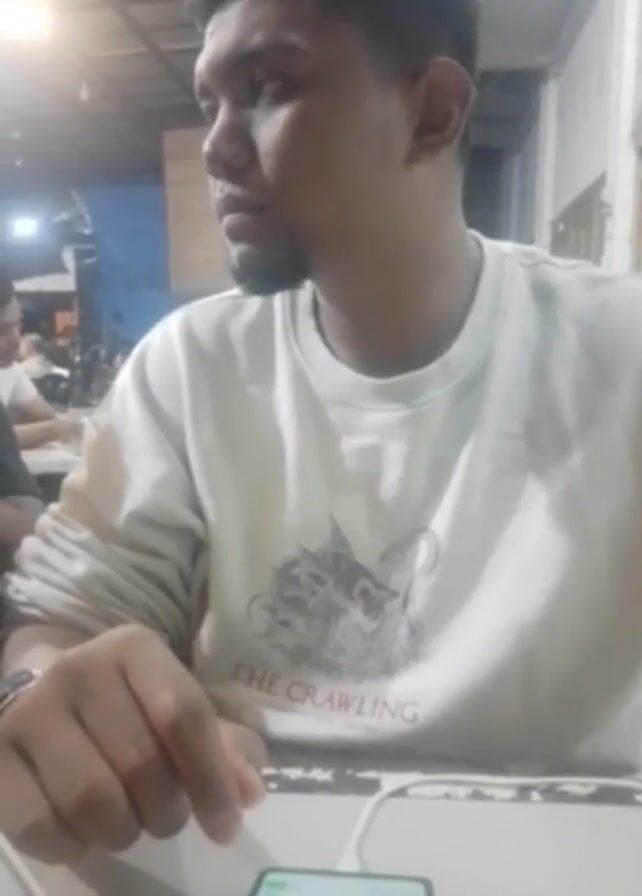 n adult man sitting at a table in a cafe, looking at his phone. He is wearing a white long-sleeved shirt with a graphic on it. A charging cable is plugged into his phone. There are other people sitting at a larger table in the background of the cafe. The room appears well-lit. A glass with a straw is on the table. The man briefly looks up and to his right, appearing to listen.
