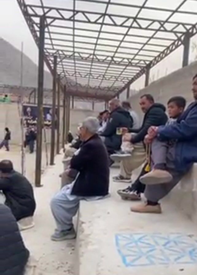 group of men sitting on concrete bleachers under a metal structure. Some are dressed in traditional clothing, others in modern jackets. One man holds a child on his lap. They appear to be watching a game or event in a dusty outdoor area enclosed by walls. Mountains are visible in the background, with unfinished buildings on the slopes. The weather looks overcast.