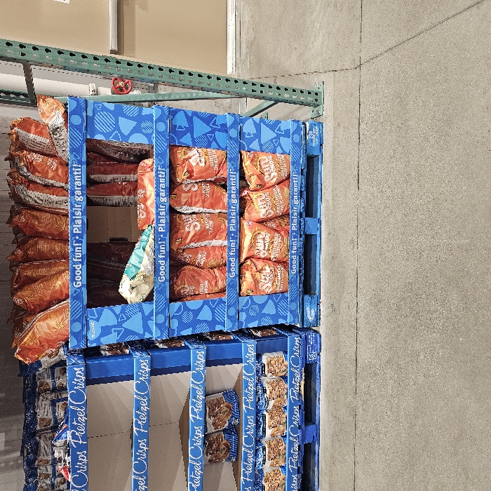 Two blue pallets are stacked. The top pallet holds bags of Sun Chips. The phrase "Good fun! Plaisir garanti!" is printed on the blue sides of the pallet. The bottom pallet holds boxes of Pretzel Crisps. The phrase "Pretzel Crisps" is printed on the blue sides of the pallet. The pallets are situated within a warehouse setting, near a gray concrete wall. Metal racking is visible above the pallets.