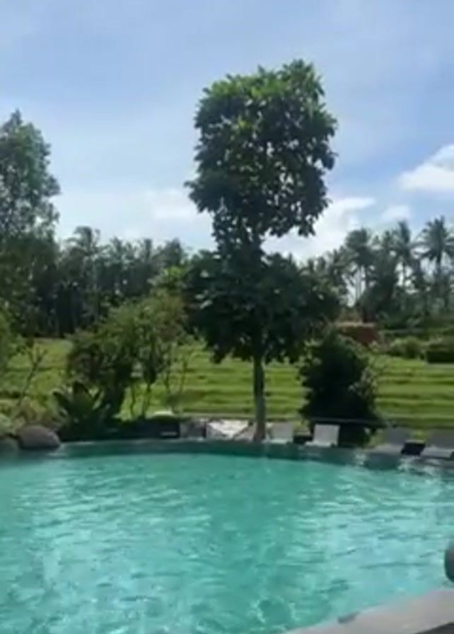 swimming pool in a lush, tropical environment. The pool water is clear and turquoise, and there are several lounge chairs lined up along the pool deck. In the background, there are tiered rice paddies, lush green trees, and palm trees. The sky is blue with some white clouds. There do not appear to be any people in the video.