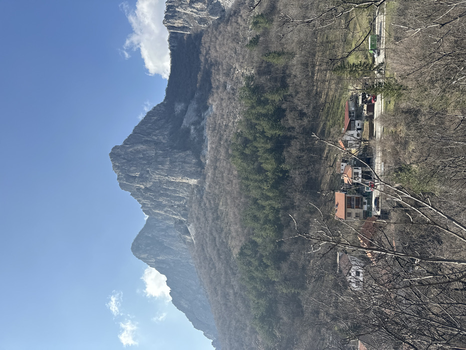 The image displays a panoramic view of a mountainous landscape in Vratsa, Bulgaria, specifically depicting the Vratsa Balkan (Vrachanski Skali). The scene is set under a clear blue sky with sparse white clouds. In the background, prominent, rugged grey limestone mountains dominate, featuring steep, rocky cliffs and visible strata. The lower slopes of these mountains are covered primarily by dense deciduous trees, currently bare of leaves, indicating late winter or early spring. A distinct band of dark green coniferous trees separates the bare deciduous forest from the steeper rock faces above. In the midground, nestled at the base of the mountains, a small settlement is visible. It comprises approximately 6-8 buildings, characterized by light-colored facades and pitched terracotta tile roofs. A paved road runs horizontally through this settlement, with a grey guardrail visible along its edge. On this road, a dark-colored sedan is parked or moving on the left, a red vehicle is further to the right, and a green truck is visible on the far right side of the road. The immediate foreground is partially obscured by out-of-focus, bare branches of deciduous trees. No discernible individuals are clearly visible. The overall lighting suggests a bright, sunny daytime environment.