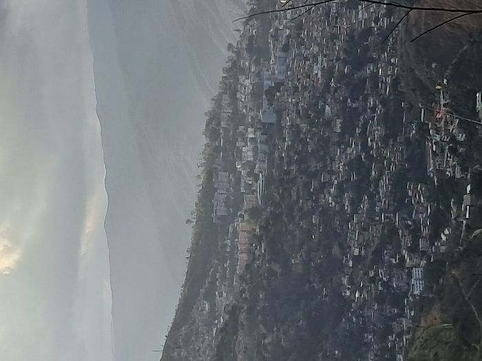 A hillside city densely packed with buildings stretches up a steep incline. The structures are predominantly light-colored, contrasting with the darker hues of the surrounding mountain terrain. Distant, hazy mountain ranges are visible in the background beneath a cloudy sky. Branch or wire-like objects are faintly present in the upper right.
