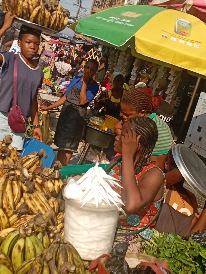The image depicts a bustling open-air market scene in Fegge, Nigeria, observed during daylight