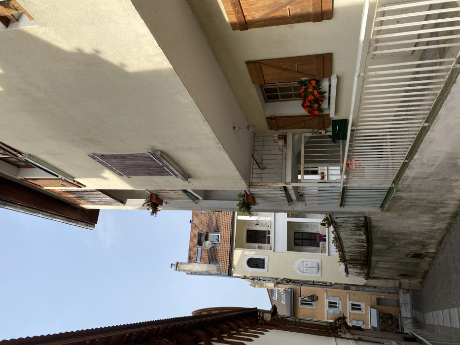 This image depicts a narrow, sloped urban street or alleyway in Évian-les-Bains, France, characterized by multi-story residential or commercial buildings