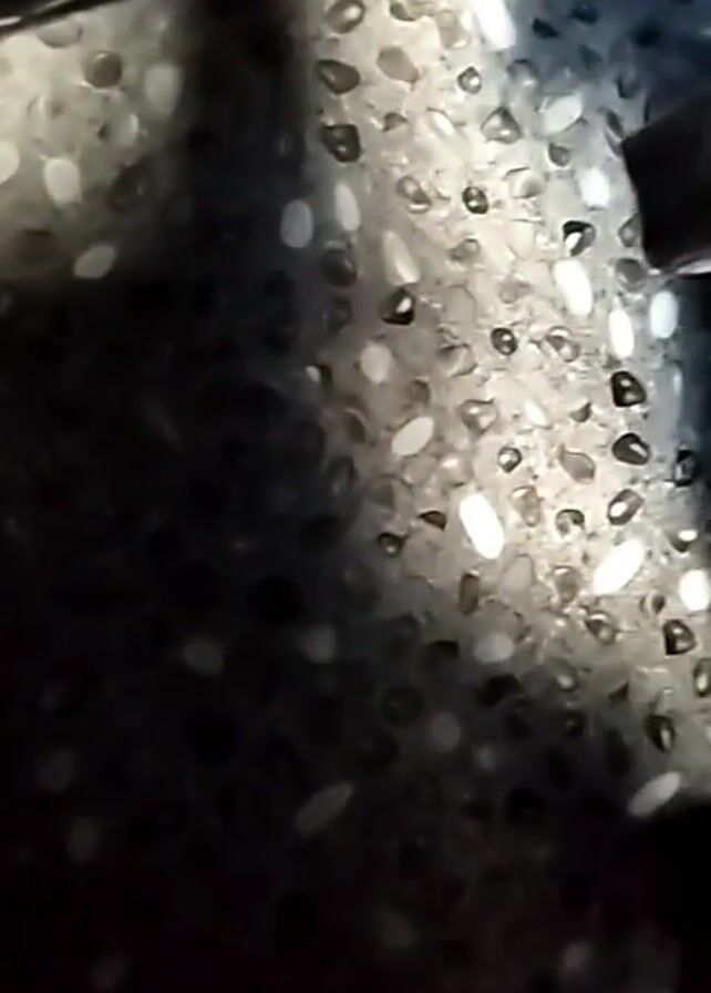 close-up view of a textured surface with small, smooth, round, white and black stones embedded in a dark-colored material, possibly resin or concrete. Light reflects off the glossy stones, creating highlights. A dark, possibly metallic object is visible in the upper right corner and moves slightly during the video. The camera remains static. Music plays throughout the video.