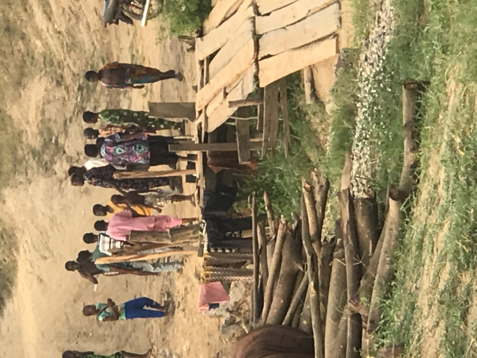 A row of people stand near a wooden structure and logs in a rural setting. Many of them wear colorful clothing. A dirt path runs beside them. To the side, a patch of grass grows near the wooden structure. A motorcycle is partially visible at the top of the frame.