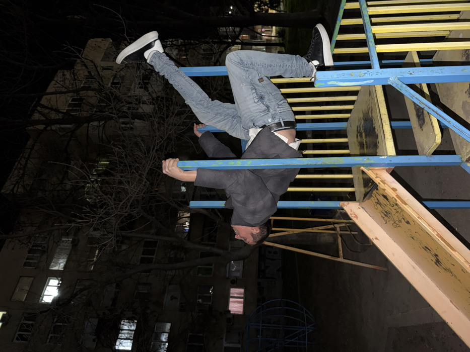 The image depicts an outdoor playground at night in Pleven, Bulgaria. An adult male is shown in an inverted position, suspended horizontally from the top of a blue and yellow metal climbing structure. He grips two blue vertical bars with both hands. His head is oriented downwards, facing upwards towards the camera. His legs are raised, with his right foot resting against a blue vertical bar. He is wearing a dark jacket, light blue denim jeans, a black belt, a white undershirt, and white underwear is visible above his waistband. He has black sneakers with white soles and white socks. To the left of the male, a segment of an orange-colored slide chute is visible. In the background, a multi-story residential building with several illuminated windows stands behind bare tree branches. A blue spherical climbing frame is partially visible in the left midground.