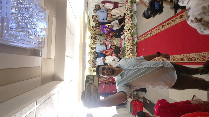 The image depicts an indoor social gathering or event, likely a wedding or engagement, located in the city of Unknown, Unknown. In the foreground, a male individual, appearing to be in his late 20s to early 30s, with short dark hair and a light complexion, stands facing the camera. He wears a light blue collared shirt, dark brown trousers, and a dark watch on his left wrist. His right arm is extended, holding a gold-colored smartphone with a multi-lens camera module, seemingly taking a selfie that includes the larger group behind him. He displays a slight smile. To his immediate left, a person in a red, embroidered traditional dress is partially visible. To his right, part of a professional video camera setup with a monitor is visible on the floor, alongside the shoulder of another person wearing a white floral garment. The central focus of the image is a large group of approximately 20-25 individuals assembled on what appears to be a decorated platform or stage in the background. This group comprises men, women, and several children, arranged for a photograph. In the center, two individuals, presumably a bride and groom, are seated. The "bride" wears a red, heavily embroidered traditional outfit with a matching head covering. The "groom" wears a white traditional sherwani-style outfit with a white head covering. Several other individuals, including children, are seated or kneeling around them; one child in a light green outfit is held by an adult. Behind the seated individuals, a larger group stands. Men in this group wear a variety of collared shirts (light blue, white, grey, brown) and some traditional garments like kurtas or vests. Women wear colorful traditional dresses, some with head coverings. Most individuals in this group are smiling and appear to be looking towards an unseen camera, distinct from the selfie-taker's phone. The environment features a white ceiling with grid panels and decorative beige accent strips, from which a large, ornate crystal chandelier hangs. The background wall behind the group is covered with white draped fabric. The front edge of the platform is adorned with a long arrangement of white and light pink flowers. A red carpet with a decorative beige and floral border runs from the foreground towards the main group, while the floor to its sides is a light-colored tile or polished surface. On the far left foreground, a red fabric item, possibly a gift bag, is visible on the floor.