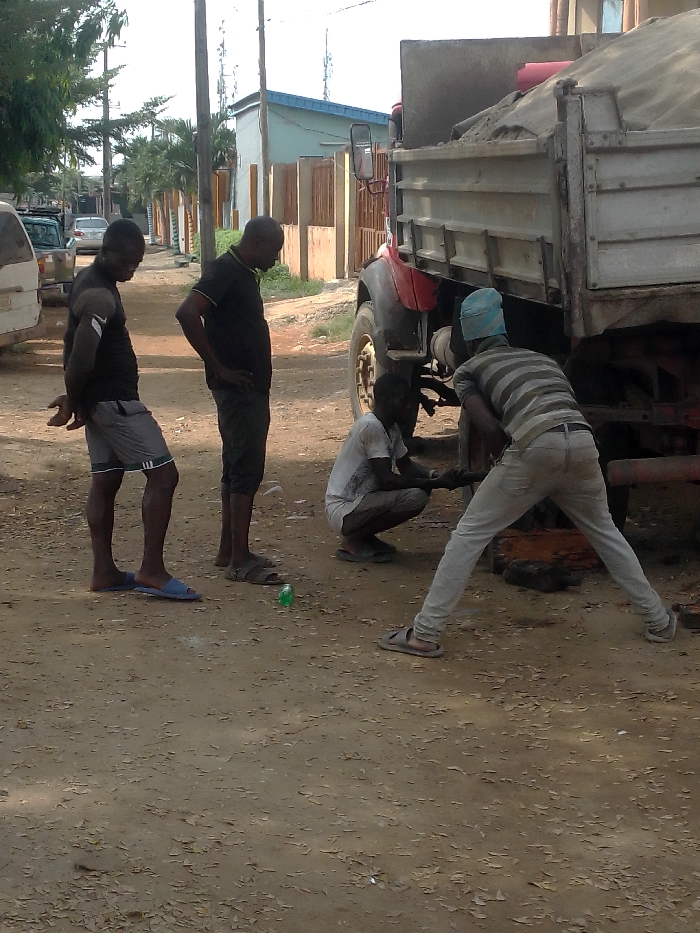 - "The scene depicts four adult males on an unpaved, dusty roadside in Lagos, Nigeria, engaged in or observing the repair of a red and white dump truck" by FM-e0XNM2, licensed under CC BY 4.0