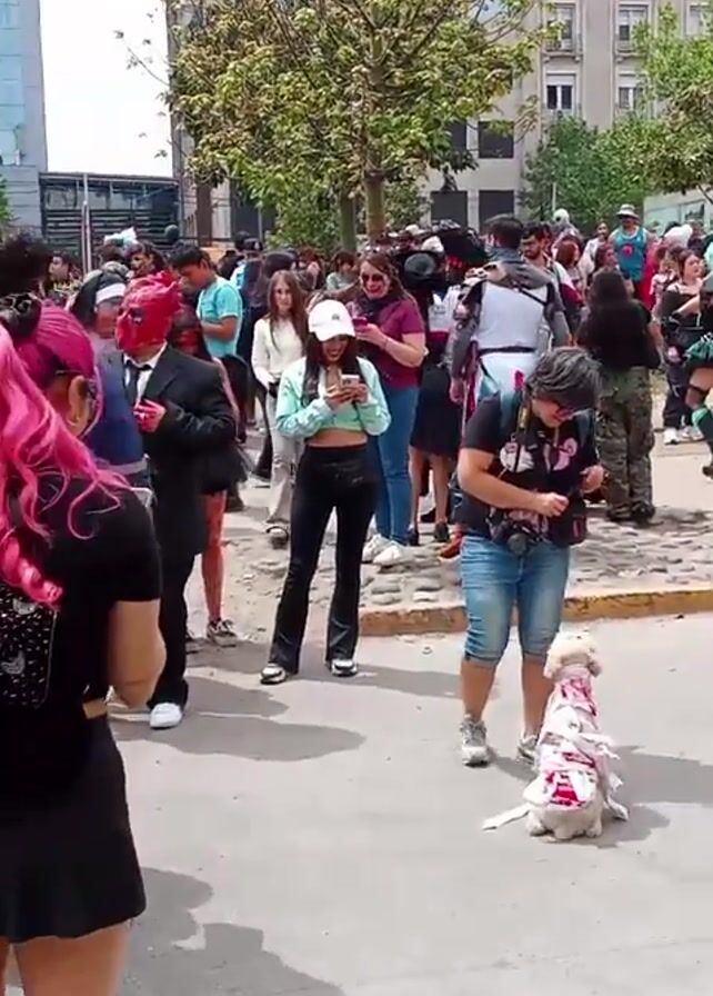 large crowd of people walking and standing on a city street, many in costume