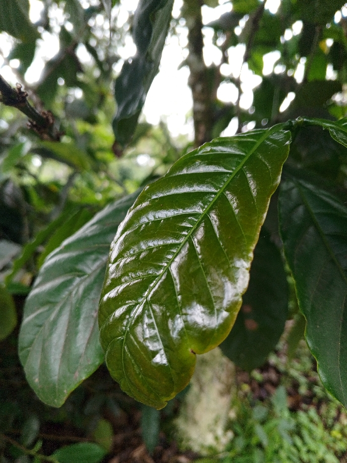 - "The image displays a close-up, upward-angled view of a single, prominent, glossy dark green leaf, likely from a coffee plant, in an outdoor setting within Pacet, Indonesia" by FM-YS7IB2, licensed under CC BY 4.0