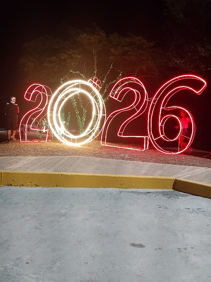 Illuminated numerals spelling "2026" stand prominently against a dark backdrop, likely at night. The '0' in "2026" is crafted into a large, glowing Christmas ornament shape with festive embellishments. The '2' and '6' are outlined with red lights. A tree with soft, green lights stands behind the numerals. To the left, a person in dark clothing is visible. The foreground is dominated by a concrete surface with a yellow curb.