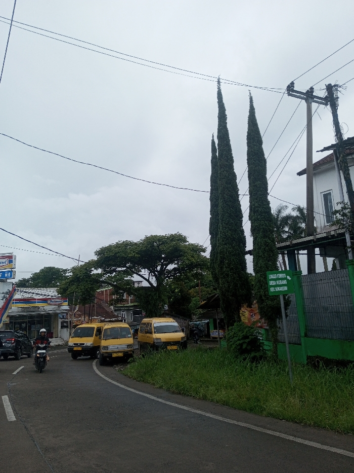 This image depicts a street scene under an overcast sky, with a green sign indicating "LOKASI PERINTIS DESA KUBANG KEC. SUKADEISI," situating the location within Sukadesi District, Indonesia. On the left side of an asphalt road with a white line marking, a single individual wearing a white helmet is operating a black motorcycle, moving towards the foreground. To the right of the road, three yellow vans, consistent with public transport vehicles, are parked on a dirt shoulder beside a strip of green grass. Further along the left side of the street, the upper section of an 'Indomaret' convenience store sign is visible, along with other commercial buildings. On the right side of the frame, several tall, slender evergreen trees stand prominently, partially obscuring a white, multi-story building behind a green metal fence. Overhead, multiple power lines crisscross the sky, supported by two wooden utility poles on the right. The general environment is urban-suburban with a mix of commercial structures, parked vehicles, and natural elements.