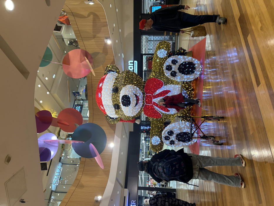 The image depicts the ground floor of a multi-level shopping center, likely Galeries Lafayette in Strasbourg, France, identifiable by the presence of an "AUCHAN SUPERMARCHÉ" sign in the background. The scene's central feature is a large, illuminated teddy bear decoration, composed of a light-covered frame wearing a red Santa hat with white trim and a red polka-dot bow. Two smaller, illuminated paw-print shapes serve as its feet. This display rests on a red mat. The polished wooden floor reflects the ambient and decorative lighting. Above, the mall features curved, wooden-paneled walls on upper levels and an open ceiling from which multiple large, irregularly shaped, translucent colored panels (pinks, purples, blues, greens, reds) are suspended. Retail storefronts, including "SMTZ" and partial signage for "beauty," are visible on the upper level, while a sign reading "AVENUE" is vertically mounted near the main display. Four individuals are present: 1. A person with their back to the camera, wearing a dark cap, dark jacket, light grey pants, and a patterned backpack, stands in the foreground-left, facing the teddy bear. 2. A woman with short, light hair, dressed in a red coat and dark pants, stands to the right of the teddy bear, holding a black object to her ear or mouth. A black and red rolling walker is positioned nearby. 3. A man wearing a red knit hat, dark hooded sweatshirt, dark pants, and grey shoes walks from right to left in the foreground-right, carrying a light brown paper bag. He glances towards the central display. 4. Another person in patterned black and white clothing is partially visible in the far background-left, moving away from the camera.