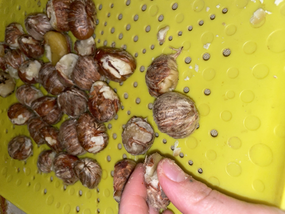 - "The image displays a close-up, high-angle view of approximately 30-40 shelled and partially shelled hazelnuts distributed across a bright yellow plastic perforated surface, resembling a kitchen strainer or colander" by FM-GgSpJ3, licensed under CC BY 4.0