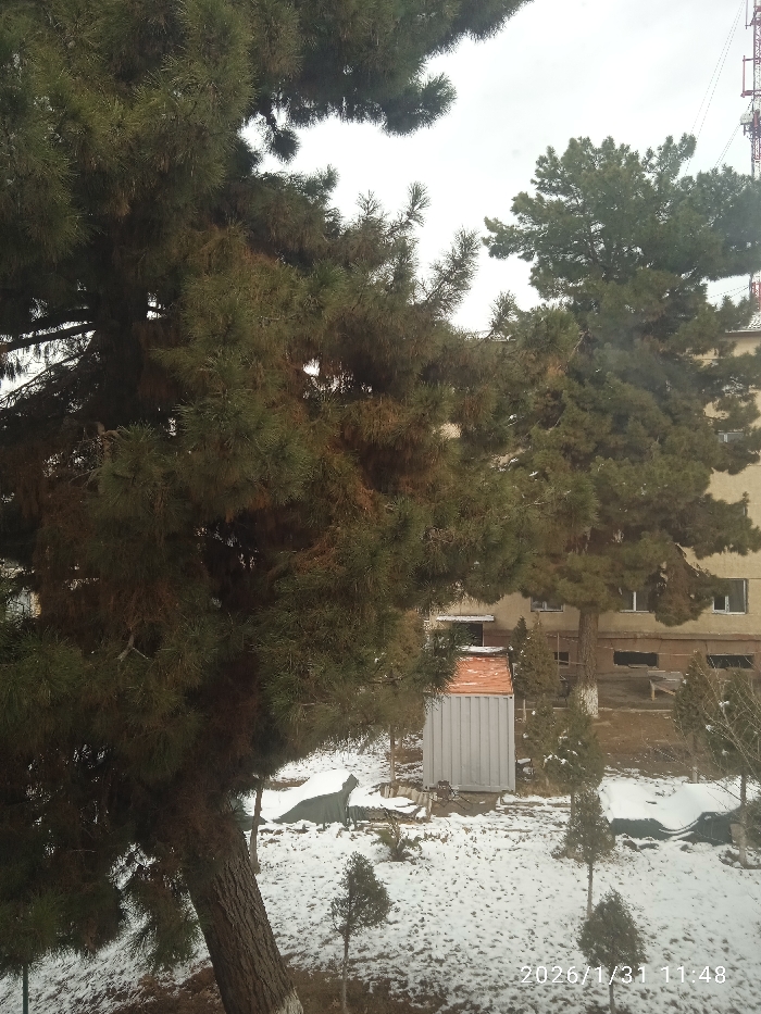 A winter scene with snow-covered ground. Trees dominate the foreground, their branches heavy with green needles. A small building with a red roof stands amidst the snow, partially obscured by the trees. A taller building rises in the background. The scene is captured on a cloudy day, as the light is soft and diffused. The timestamp "2026/1/31 11:48" is visible at the bottom.