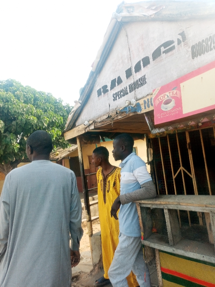 This image depicts an outdoor scene in the city of Pantame, Nigeria, featuring three males near a commercial structure