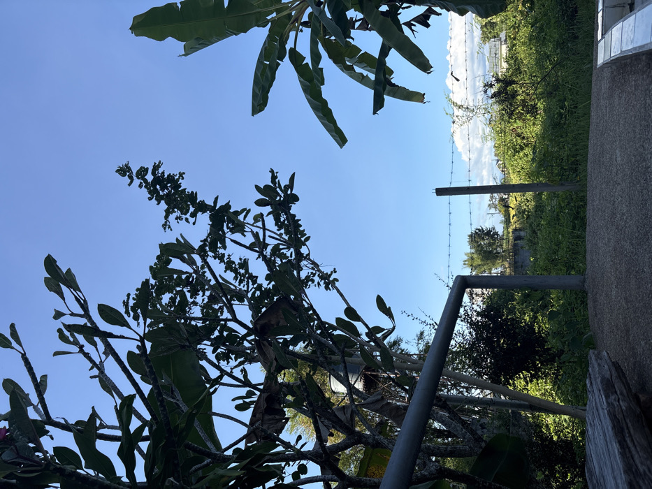 This image depicts an outdoor scene in Pai, Thailand, under a clear, bright blue sky with sparse white cumulus clouds visible on the horizon. The foreground features a weathered, grey wooden element, possibly part of a bench or step, in the bottom left corner. A grey metal pipe railing, composed of a horizontal bar connected to a vertical post, extends from the lower-left into the center of the frame. Lush, dense green vegetation dominates the midground, with silhouetted branches and broad leaves of a tree, likely Plumeria, framing the left side and upper center. Prominent large, dark green leaves of a banana plant occupy the right side of the frame. Beyond the immediate vegetation and railing, a fence line runs across the midground, consisting of grey concrete posts strung with multiple lines of barbed wire. Behind the fence, a field of green undergrowth extends towards the horizon, where distant trees and white-walled buildings with visible rooftops indicate human settlement. Partially obscured by foliage on the far left, a metal water tank elevated on a support structure is visible. The ground in the immediate mid-foreground is a textured grey surface, consistent with gravel or rough concrete. No individuals or specific actions are depicted in the scene, which is illuminated by direct daylight, casting some elements into silhouette.