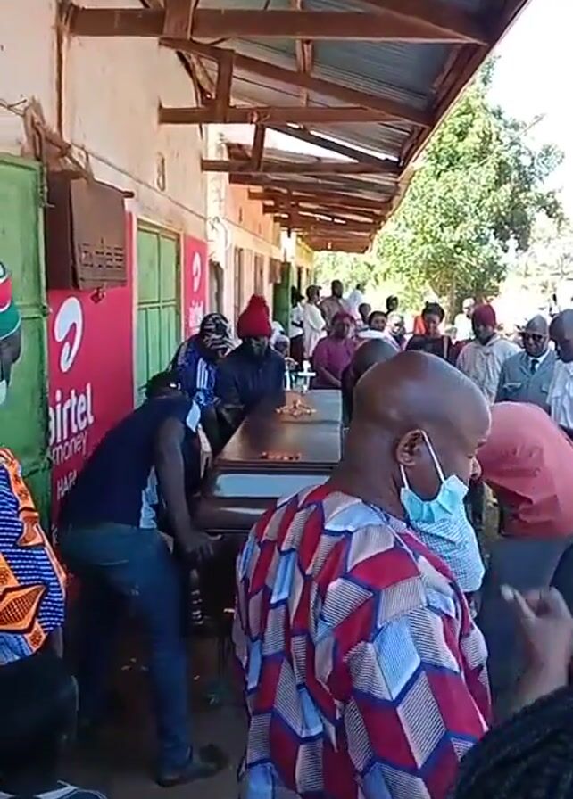 Here is a detailed description of the video: The video shows a group of people gathered outdoors, seemingly at a funeral or wake. They are clustered around what appears to be a casket, which several men are carrying or adjusting. The casket is adorned with what could be flowers or other decorative items. Many of the attendees are wearing traditional clothing or head coverings. There is also a man in a red and blue patterned shirt prominently visible in the foreground. Some people are wearing face masks. The event seems to be taking place in a somewhat rural area, possibly outside a building with an Airtel Money advertisement displayed. The building has a simple corrugated iron roof overhang. There is some greenery visible in the background, including trees. The weather appears to be sunny.