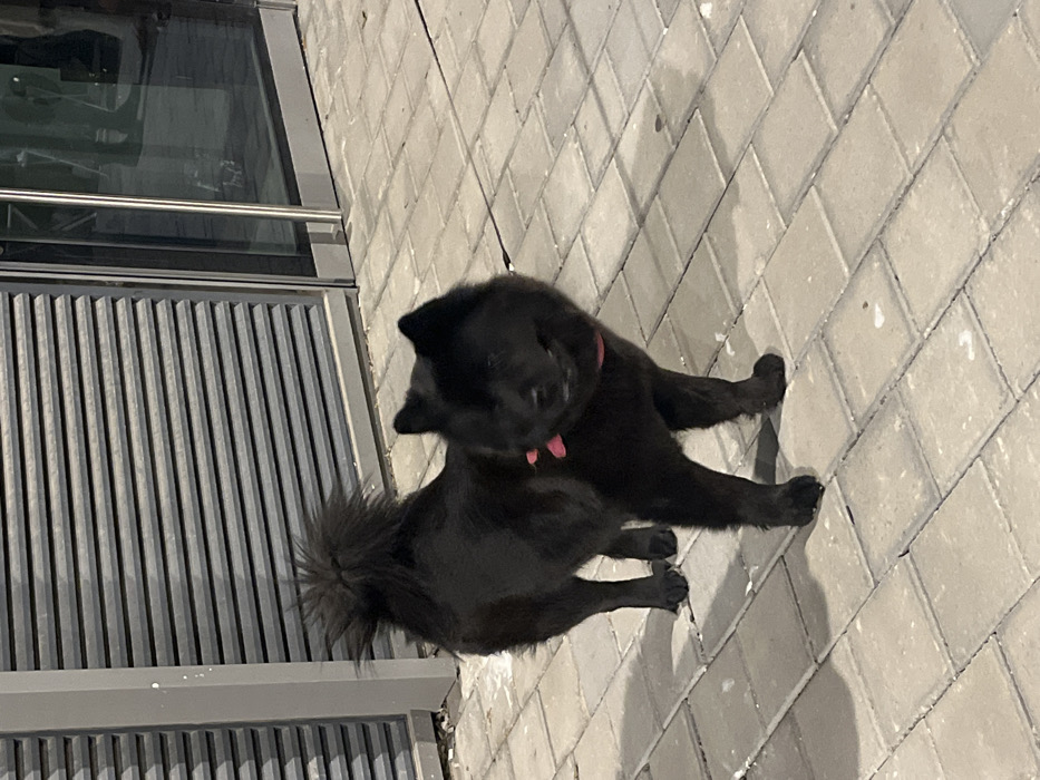 - "A medium-sized black dog, possibly a Spitz or Chow Chow mix with short-cropped body fur, a rounded head, and a fluffy, tightly curled tail resting over its back, stands on a paved surface" by FM-dAsLf1, licensed under CC BY 4.0