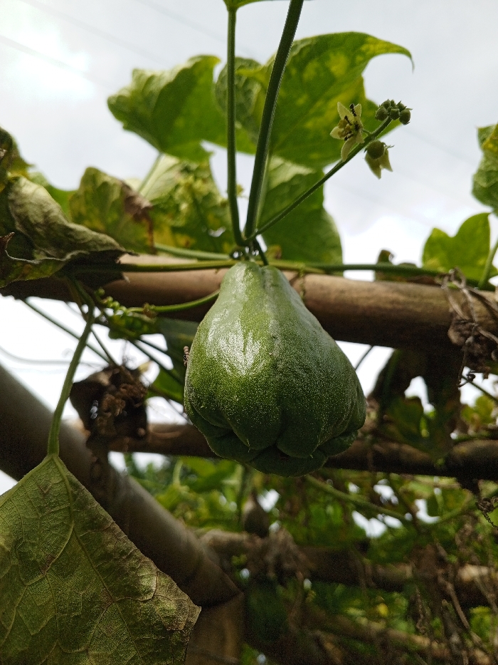 - "A close-up, upward-angled forensic image captures a single, unripe, dark green chayote fruit (Sechium edule) suspended from its vine" by FM-ohXuq1, licensed under CC BY 4.0