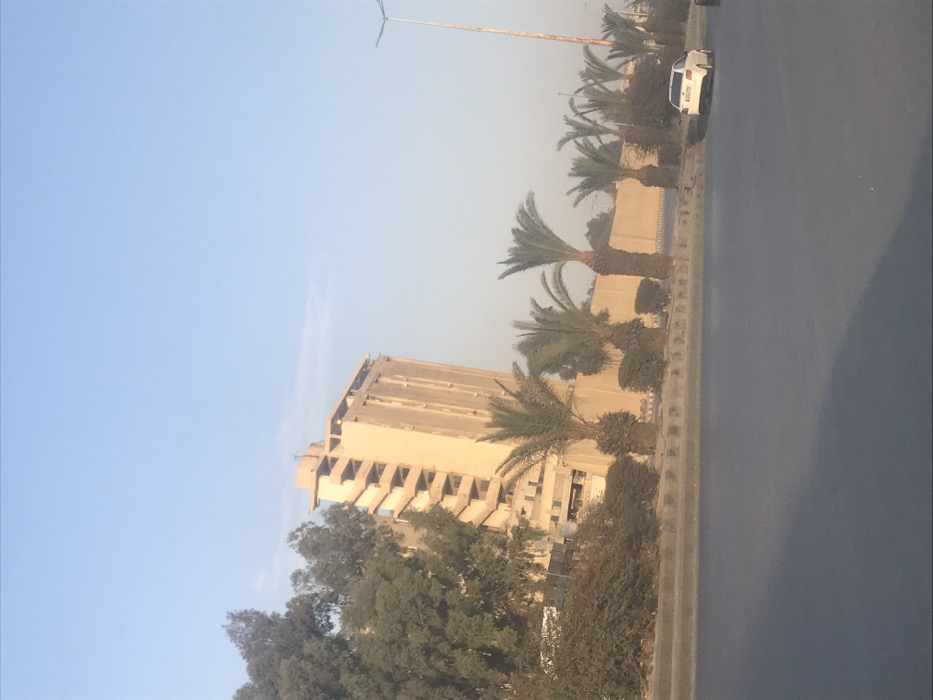 This image captures an urban street scene in Ash-Shaghour Municipality, Damascus, Syria, under the natural light of either early morning or late afternoon. The prominent structure is the multi-story Damascus Governorate Building, a light-beige concrete edifice featuring a distinctive stepped or angular facade on its left side, resembling an external staircase or terraced design. Vertical relief elements are visible on the building's main face. In the foreground, a wide, multi-lane asphalt road extends across the lower portion of the frame, bordered by a concrete curb. A landscaped median or sidewalk strip runs parallel to the road. On the left, dense green foliage, including tall trees and shrubs, partially obscures the lower sections of the main building. On the right, a row of approximately ten mature palm trees, varying in height, lines a light-colored concrete wall or barrier, interspersed with lower shrubs. A tall, multi-armed street light pole is visible on the right side, extending upwards into the clear, blue sky, which transitions to a lighter, hazy blue-white closer to the horizon. A white sedan is parked or slowly moving on the far right lane of the road in the distance. No individuals are visible, and no specific actions or interactions are depicted. The environment is urban with a significant presence of natural foliage.