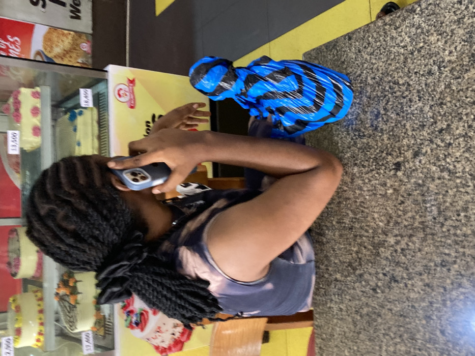The image depicts the interior of a Crunchies bakery/cafe, presumed to be in Aba, Nigeria. A female individual is seated at a mottled grey table, viewed from the back-right. She has dark skin and braided black hair, styled into twists and secured in a ponytail with a black scrunchie. She wears a dark, possibly navy, sleeveless top with lighter, irregular patterns. Her right hand holds a light blue smartphone to her right ear, indicating she is engaged in a phone call. Her left forearm rests on the table surface. To her immediate right, on the table, is an irregularly shaped object wrapped in blue plastic with horizontal black stripes. In the background, a glass display case contains multiple decorated cakes with visible price tags in Nigerian Naira, ranging from N 7,400 to N 18,400. The "CRUNCHIES" brand logo is visible on a yellow panel beneath the cake display. The floor is dark, marked with a prominent yellow stripe.