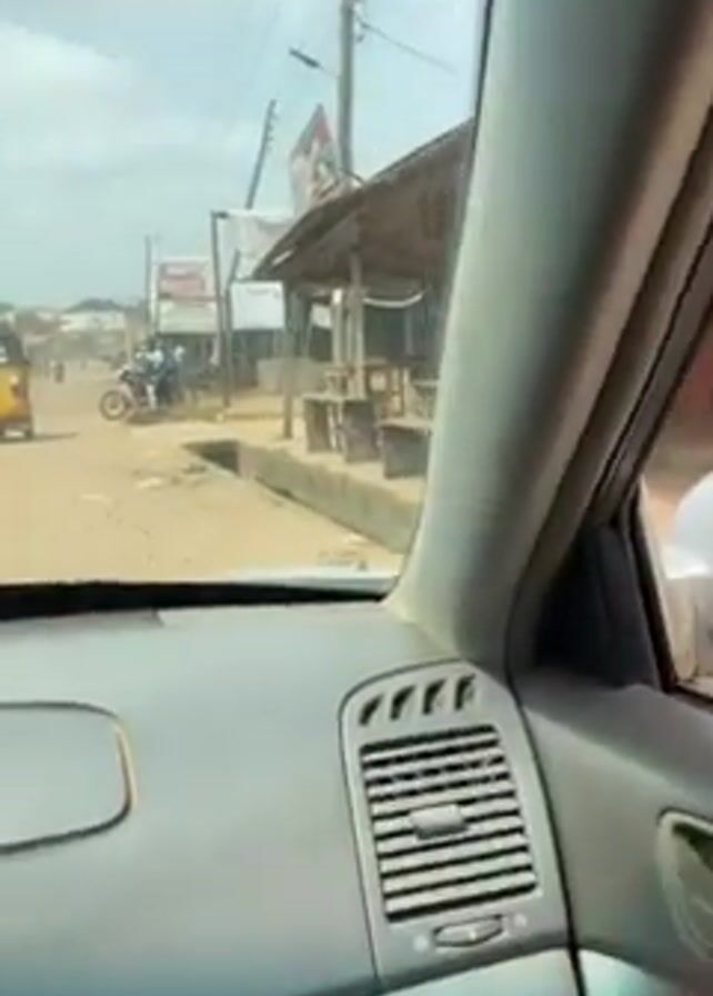 The camera is positioned inside a car driving down a dirt road in what appears to be a rural or developing area