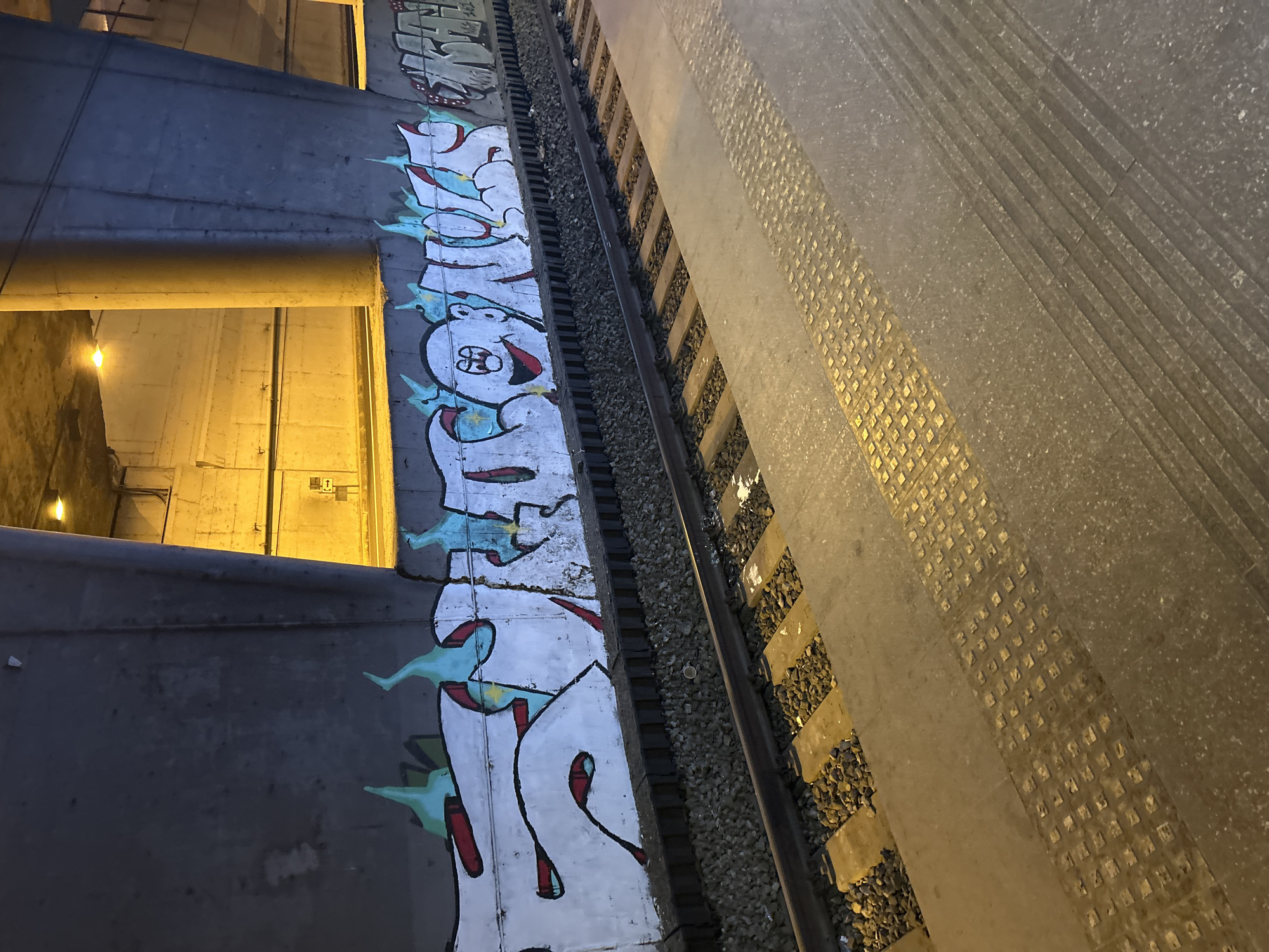 The image depicts a railway platform and track located beneath a concrete overpass or tunnel entrance in Iraklio, Greece. A large, grey concrete support pillar stands towards the right, rising from a concrete base. The lower portion of an adjacent concrete wall is covered with graffiti, which primarily consists of stylized white bubble letters outlined in black, accented with red and light blue-green. One graffiti character on the wall portrays a white face with a red smiling mouth and black eyes. A single railway track runs horizontally across the mid-ground, consisting of two steel rails, wooden sleepers, and a bed of gravel ballast. In the foreground, a grey concrete platform features tactile paving, specifically a strip of raised square studs and an adjacent strip of parallel, raised lines. The scene is illuminated by overhead artificial yellow light sources. No individuals, actions, or interactions are present within the frame.
