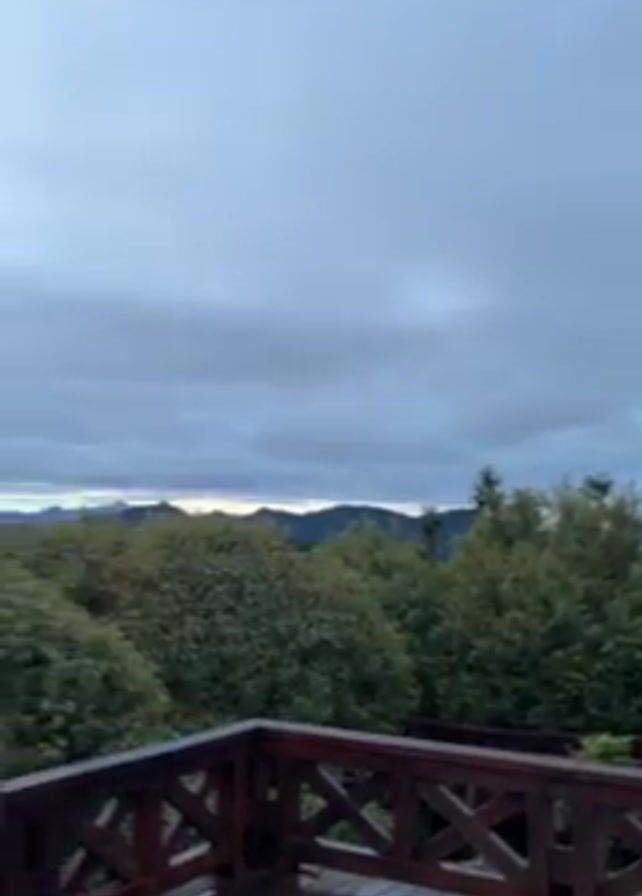 view from a wooden balcony or deck with a dark brown railing in a natural setting. The sky is overcast with grey clouds. In the background, there is a dense collection of green trees and mountains in the distance, appearing muted due to the cloudy weather. A boy and a girl walk towards a sign on the balcony. The wooden planks of the deck appear damp or wet. The camera briefly pans to the right, focusing on the trees and mountains in the background.