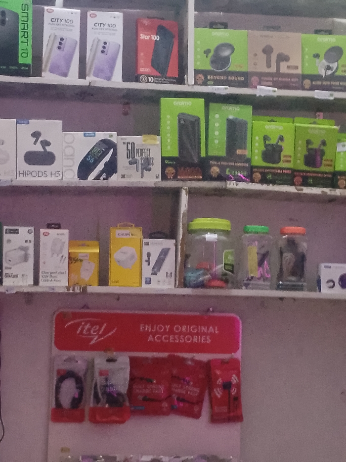 shelf stocked with various electronics and accessories. The top shelf contains boxes labeled "SMART 10", "CITY 100", "Star 100", "HIPODS H3", and "50 PERFECT SOUNDS". There are also boxes of oraimo products, including earbuds and power banks. The middle shelf displays phone chargers and other small accessories, alongside several plastic jars. The bottom shelf features a red "itel ENJOY ORIGINAL ACCESSORIES" sign with various phone accessories.