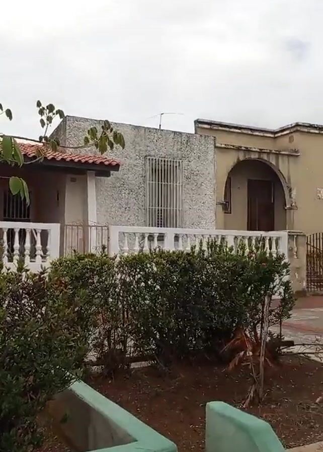 The camera slowly pans across a public space featuring buildings, landscaping, and a paved walkway. Buildings are mostly one-story, with variations in color and architectural style, including white, tan, and painted murals. The landscaping consists of low hedges, trees, and planters, all giving a sense of a well-maintained, older neighborhood. The walkway is paved with a combination of gray tiles and red bricks. The sky is overcast, suggesting diffused lighting throughout the scene. The camera moves steadily, offering a comprehensive view of the square and its surroundings.