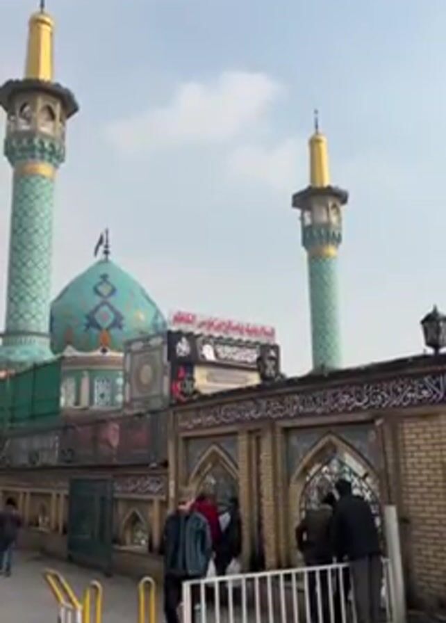 mosque with a large turquoise dome and two tall minarets with gold tips. The minarets are decorated with light green patterns. A wall with ornate tilework surrounds the base of the mosque, and a black banner with Arabic script and a portrait is visible above the wall. Several people are standing near the entrance to the mosque, and a man walks along a sidewalk in the foreground. The sky is light blue. The overall atmosphere seems religious and solemn.