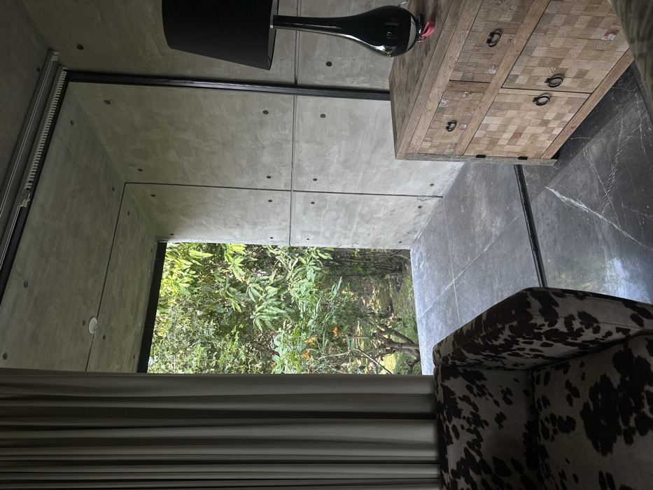 A modern interior showcases a minimalist design with concrete walls and a window framing a lush green exterior. A dresser sits atop a dark stone floor, illuminated by a lamp. The room is oriented with a view of dense foliage. A chair with a cow-print pattern is visible near a window that is partly obstructed by a curtain.