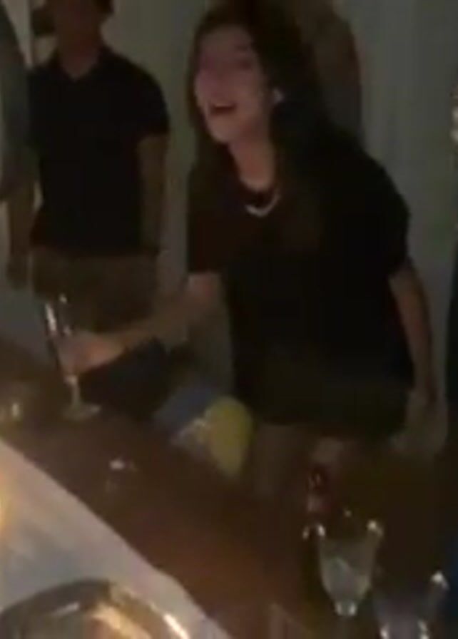 group of approximately 7 people gathered around a long table with lit candles. There is a cake on the table. Some of the people are holding glasses. They appear to be celebrating a birthday, singing "Happy Birthday" to a young woman in a black shirt and dark skirt. The room is lit primarily by the candles and overhead lighting is visible. Three large decorative objects are behind the table. A window is visible in the background.