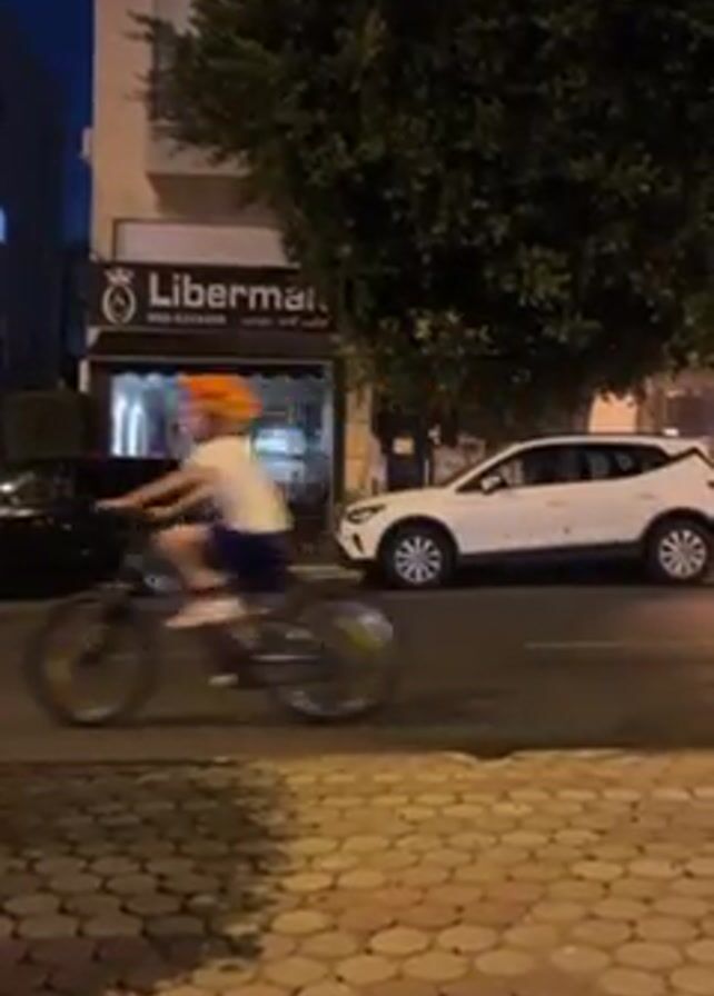 street scene at dusk, with two cyclists passing by a row of parked cars and a store. The first cyclist, dressed in a red shirt and blue shorts, rides a dark-colored mountain bike. The second cyclist wears a white shirt and appears to be doing a wheelie. Both are traveling in the same direction. The street is paved with a patterned arrangement of blocks. A store with a sign saying "Liberman" and a phone number is visible in the background. The sky is a dark blue, and there are trees lining the street. Parked cars are visible along the street, including a white SUV and a black compact car. There are shouts from an unseen person or people.