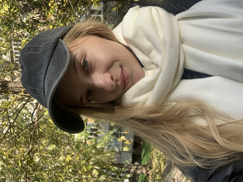 The image displays a young adult female in a headshot-style portrait, taken outdoors during daytime in Kyiv, Ukraine