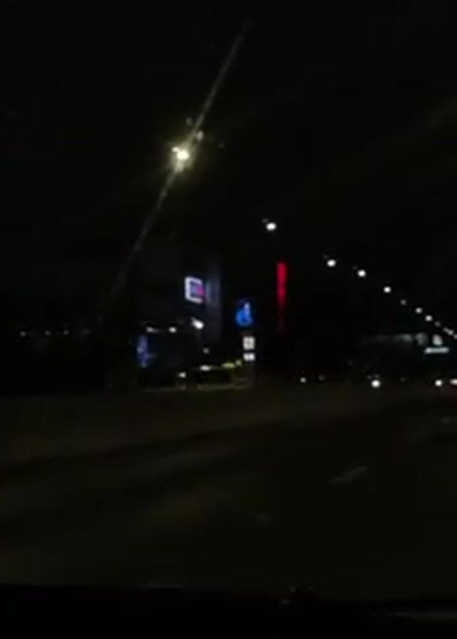 night-time drive along a dark road. Streetlights illuminate the scene, and other cars are visible on the road. Buildings with lit signs can be seen in the background. The perspective is from inside a car.