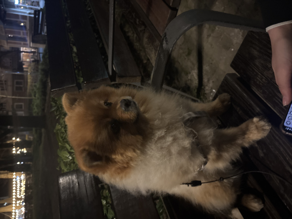 - "A small, bi-colored dog, likely a Pomeranian, is depicted seated on a dark wooden slatted park bench at night in the city of Kyustendil, Bulgaria" by FM-MNpyC2, licensed under CC BY 4.0