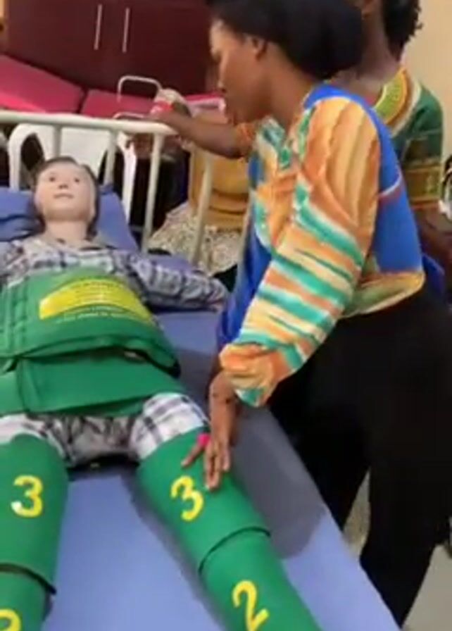 what appears to be a medical demonstration or training session in a hospital room. Several women, possibly healthcare professionals, are gathered around a mannequin lying in a hospital bed. The mannequin is wearing an exercise suit, and has green compression devices wrapped around its legs, numbered from one to three. One woman in a colorful shirt is gesturing toward the mannequin’s leg, while another, wearing a black shirt and a floral skirt, checks its pulse, or interacts with it in some way. There is an eye chart on the wall, suggesting an area dedicated to vision testing. The setting seems to be a room used for medical instruction or simulation, with an emphasis on patient care and education.