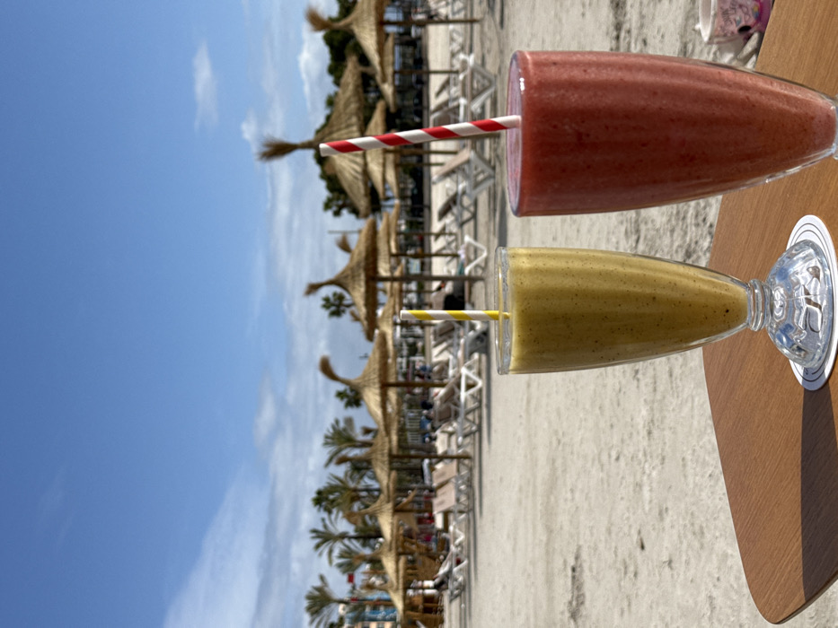 The scene depicts a sunny beach in Alcúdia, Spain. In the foreground, two tall glasses containing smoothies are positioned on a light brown wooden table. The glass on the left holds a yellow-green smoothie with a yellow and white striped straw, resting on a white coaster. The glass on the right contains a red smoothie with a red and white striped straw. A portion of a small white mug with a pink design is visible on the far right of the table. The midground features a sandy beach populated with numerous straw-thatched parasols and white sun loungers. Several indistinct human figures are visible reclining on these loungers. In the background, palm trees and resort buildings are present under a clear blue sky with sparse white clouds. The overall impression is one of leisure in a coastal environment.
